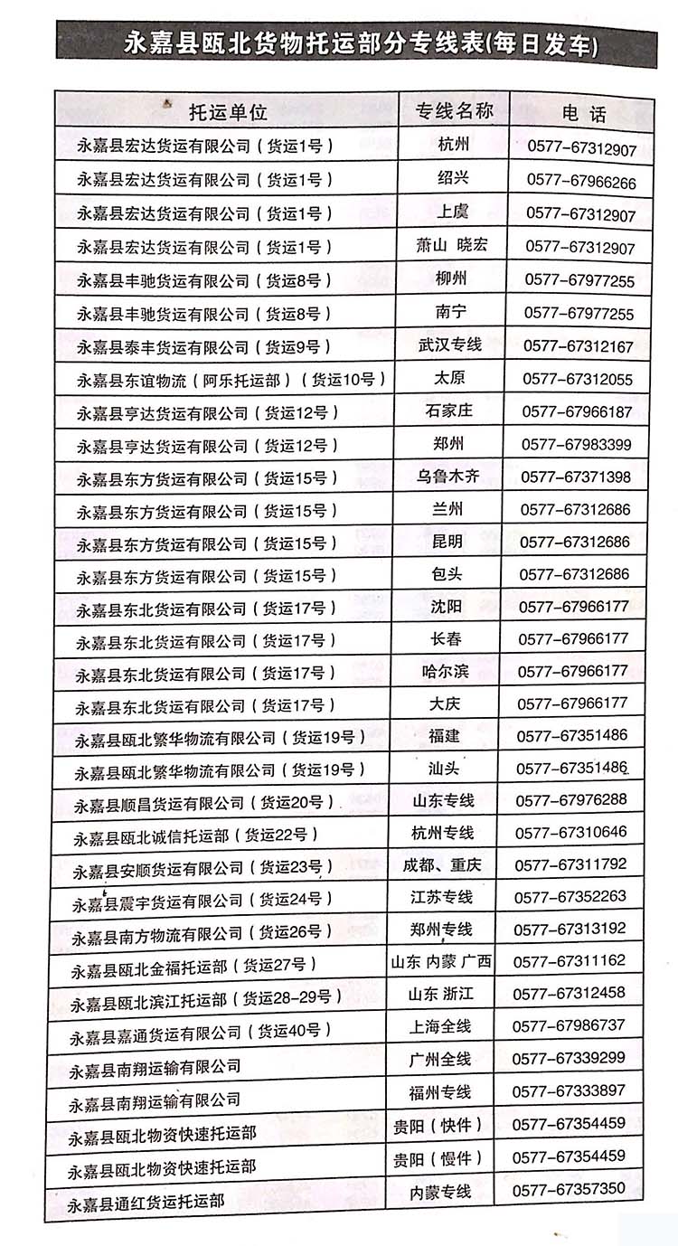 永嘉縣甌北鎮貨運部托運部電話號碼發全國各地